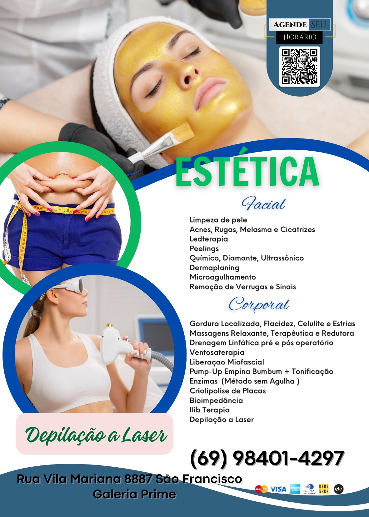 SERVIÇO DESCONTO (%) Manicure e pedicure 5% Cabelos 10% a 20% Estética facial 10% Estética corporal 10% Micropigmentação 10% a 20% Extensão de cílios 10% Podologia 10% Epilação 10% Remoção a laser 20% Endereço: Av. Campos Sales, 4426 - Nova Floresta, Porto Velho - RO, 76807-081