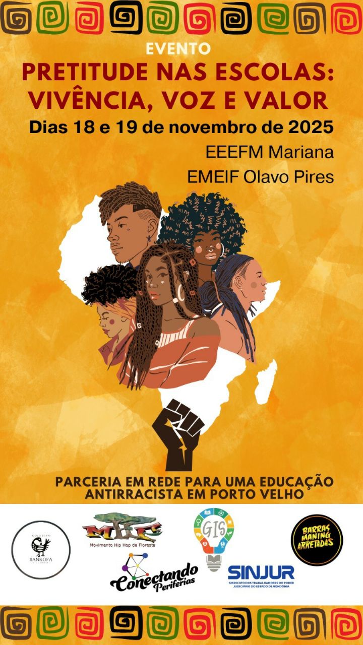 Duas escolas públicas irão receber atividades relativas a Semana da Consciência Negra na próxima semana. Trata-se do evento "Pretitude nas Escolas: Vivência, Voz e Valor". O evento vai acontecer no dia 18 de novembro na Escola Estadual Olavo Pires e no dia 19 de novembro na Escola Estadual Mariana. O evento é formado por uma parceria em rede para educação antirracista em Porto Velho. O Instituto é o responsável por idealizar a iniciativa, que tem o apoio do Sindicato dos Servidores do Poder Judiciário do Estado de Rondônia (Sinjur), do Movimento Hip Hop da Floresta (MHF), do projeto Barras Maning Arretadas, do projeto Conectando Periferias, e do Coletivo Sankofa.